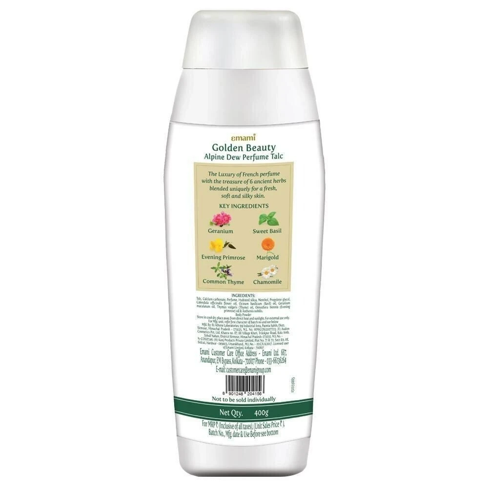 Stay cool, fresh, and fragrant all day with Emami Golden Beauty Alpine Dew Talc. Infused with a refreshing alpine dew fragrance, this premium talcum powder absorbs sweat, controls body odor, and keeps your skin smooth and dry even in hot and humid weather. Its fine texture glides easily on the skin, leaving behind a soothing, long-lasting fragrance.