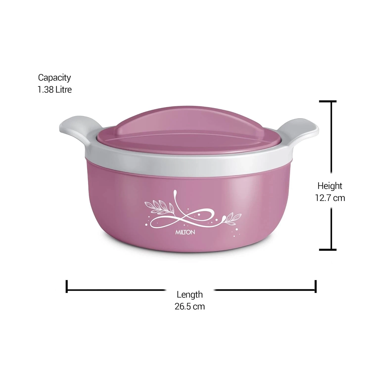 Serve meals hot and fresh with the MILTON Crave 1500 Insulated Casserole. Built with a high-quality stainless steel inner body and PU insulation, it retains the temperature of food for hours while preserving freshness and flavour. With a 1380 ml capacity, it’s perfect for storing roti, biryani, curries, rice, or snacks. The sturdy lid ensures secure closure, and the elegant pink design adds a stylish touch to your kitchen or dining table.