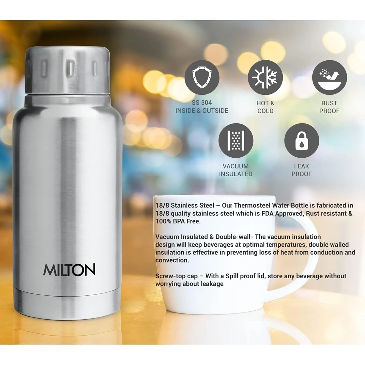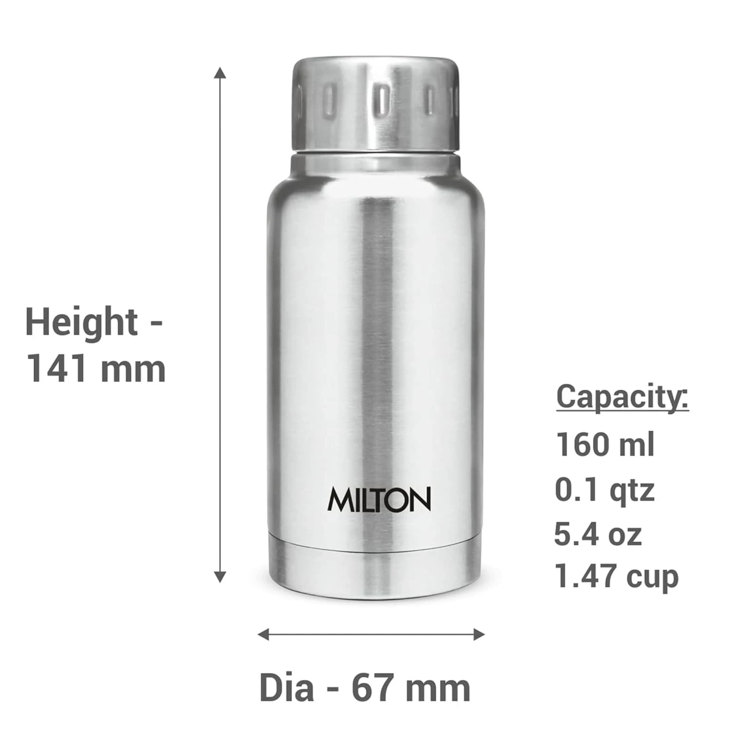 Stay hydrated in style with the Milton Elfin 160 Thermosteel Water Bottle. Compact yet powerful, this 160 ml vacuum-insulated bottle keeps beverages hot or cold for up to 24 hours. The leak-proof lid ensures zero spills, making it safe to carry in bags. Crafted from durable stainless steel and ISI certified for quality, it’s the perfect companion for office, gym, school, or travel. Its sleek silver finish adds a premium touch.