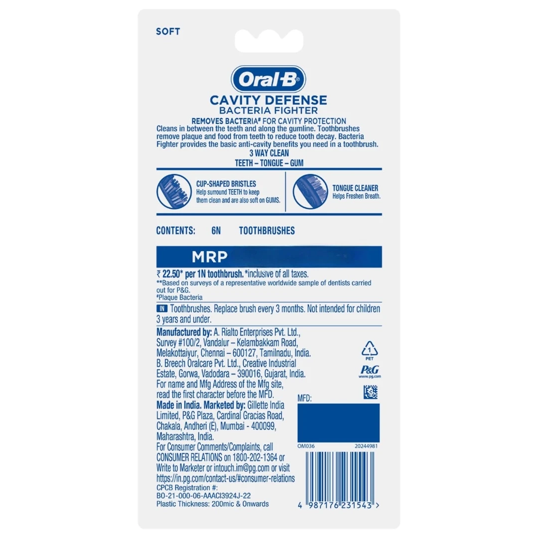 Oral-B Cavity Defense Toothbrush is designed to provide superior cleaning for healthy teeth and gums. Its soft end-rounded bristles gently clean teeth while being safe on enamel and gums. The brush head is designed to reach deep between teeth and along the gumline, effectively removing plaque and food particles. With an ergonomic handle, it offers a firm grip and better control, ensuring a comfortable brushing experience every day.