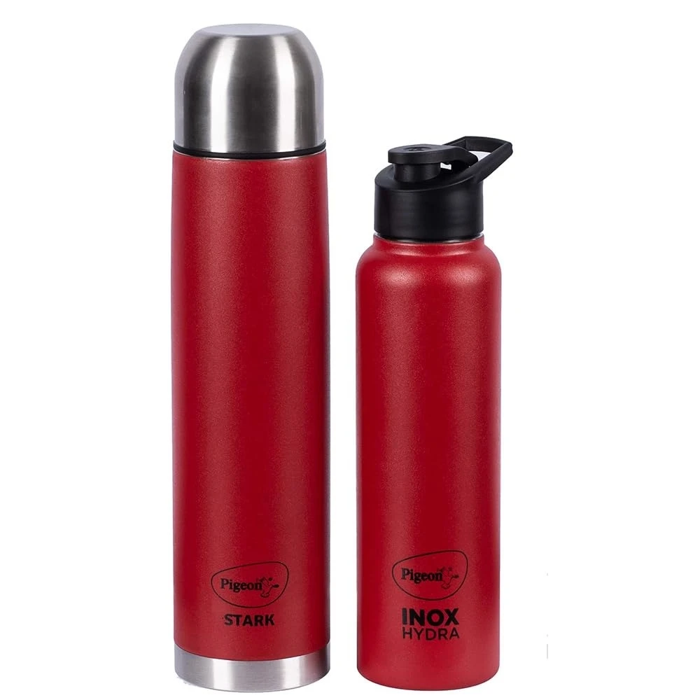 Stay hydrated with this premium combo pack of Pigeon by Stovekraft Therminox Stark Plus Flask (1000 ml) and INOX Hydra Stainless Steel Fridge Bottle (900 ml).