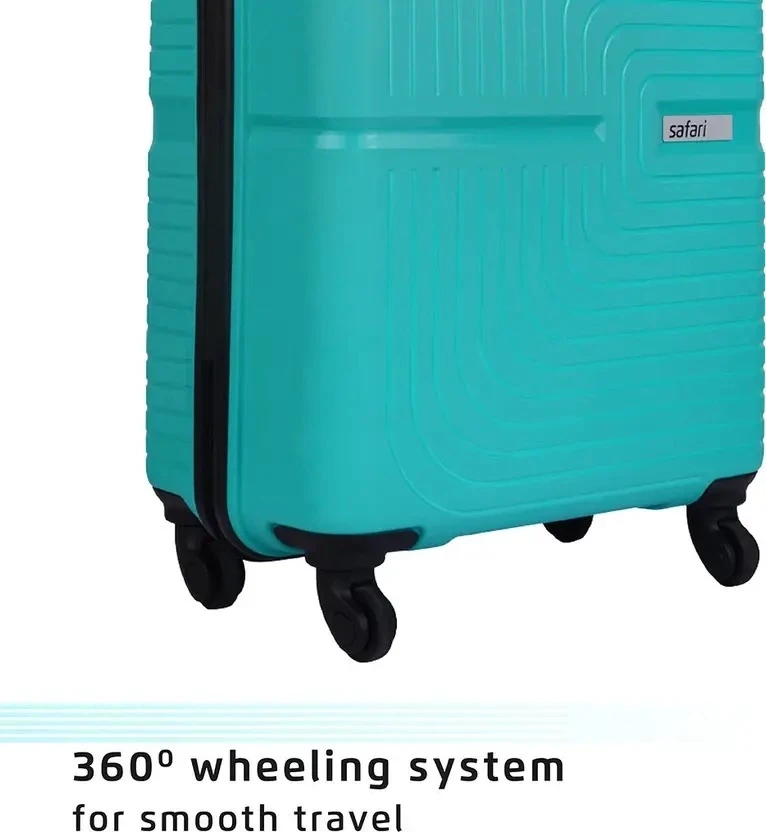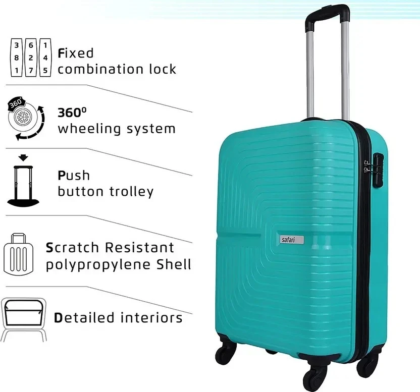 Travel in style with the Safari Eclipse 55 cm Small Cabin Suitcase in a vibrant teal hue. Crafted from durable polypropylene, this hard-shell suitcase offers a perfect blend of strength and lightweight design. The 4-wheel spinner system ensures effortless 360° maneuverability, making it ideal for both business and leisure travel. With a generous capacity of 49 liters, it provides ample space for your belongings while keeping them secure.