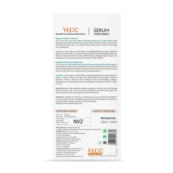 VLCC Serum Face Wash Neem & Aloe Vera Combo is a unique blend that combines the purifying power of Neem with the soothing and hydrating benefits of Aloe Vera. This serum-based face wash gently cleanses impurities, removes excess oil, and helps control acne-causing bacteria, while maintaining skin’s natural moisture balance. Suitable for daily use, it leaves skin fresh, soft, and revitalized.