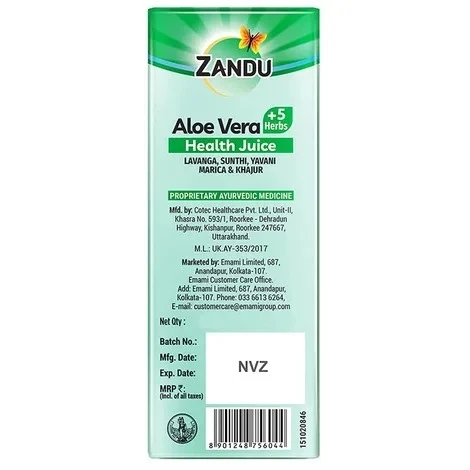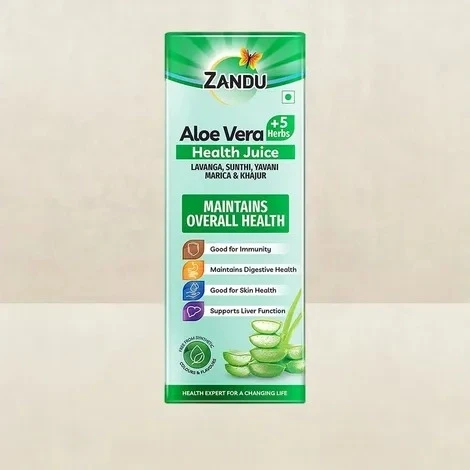 Zandu Aloe Vera Juice is a natural health tonic made from pure Aloe Vera extracts, known for their numerous wellness benefits. Rich in essential nutrients, enzymes, and antioxidants, it helps detoxify the body, supports digestion, boosts immunity, and promotes healthy skin and hair. Regular consumption helps maintain overall health and well-being.